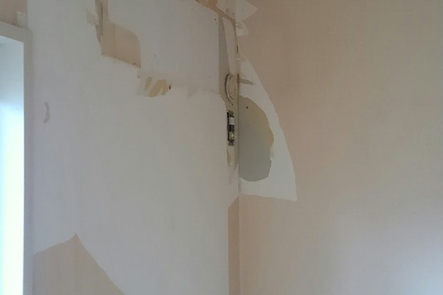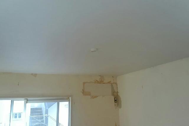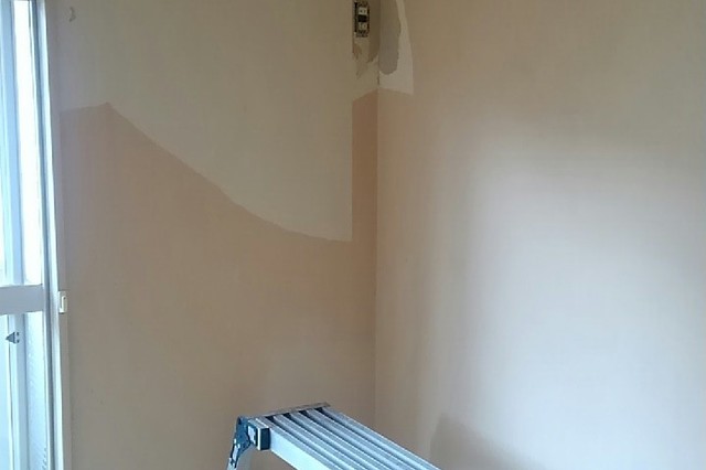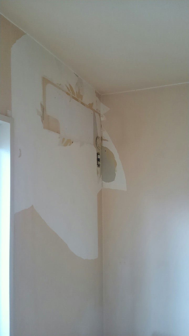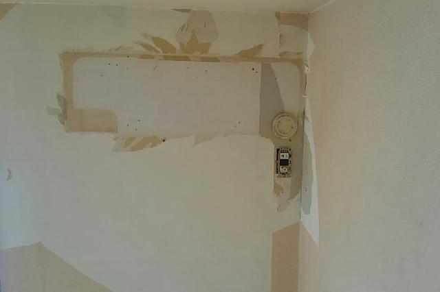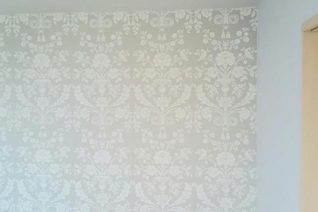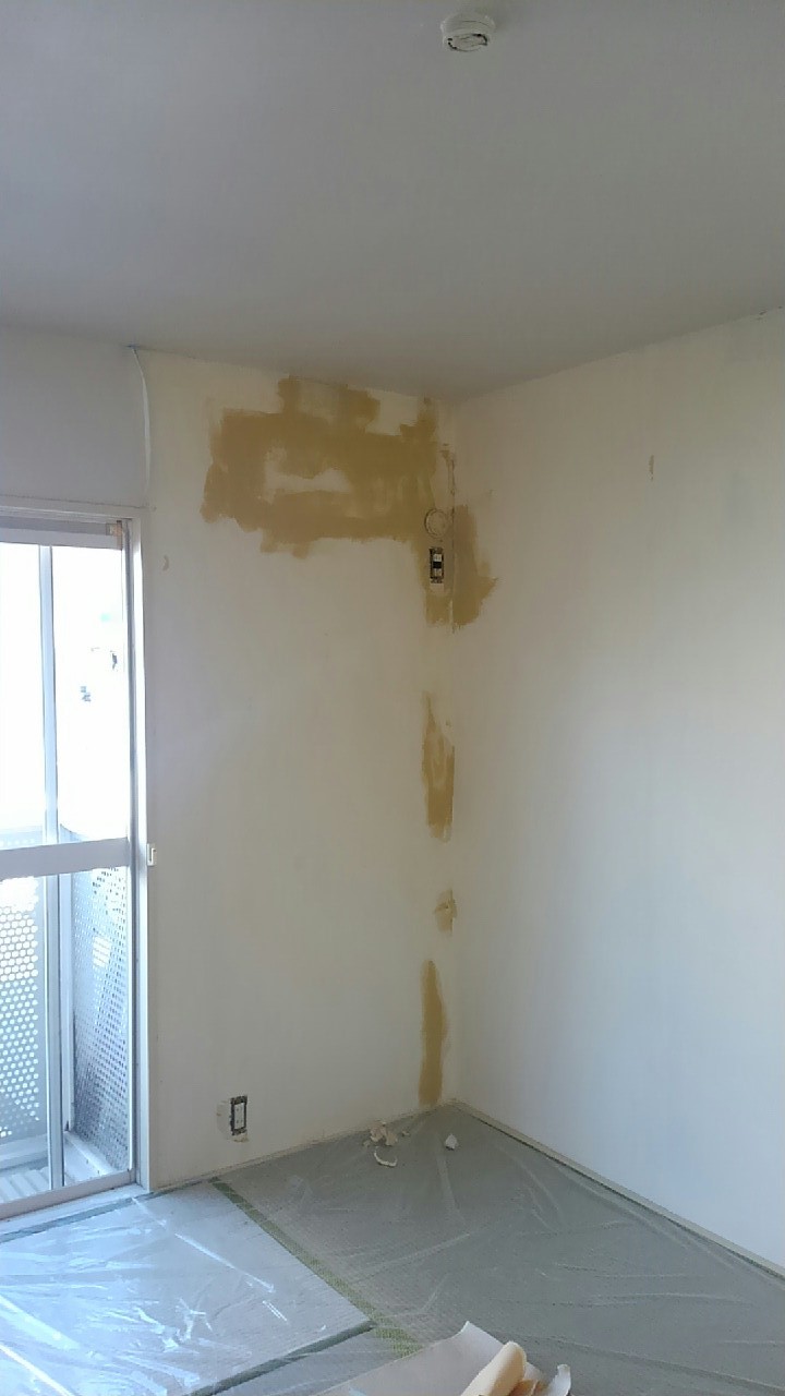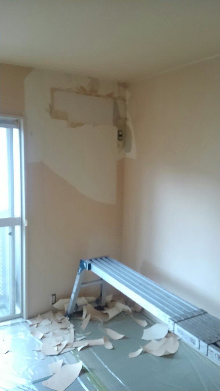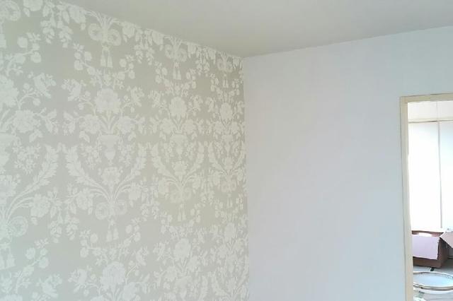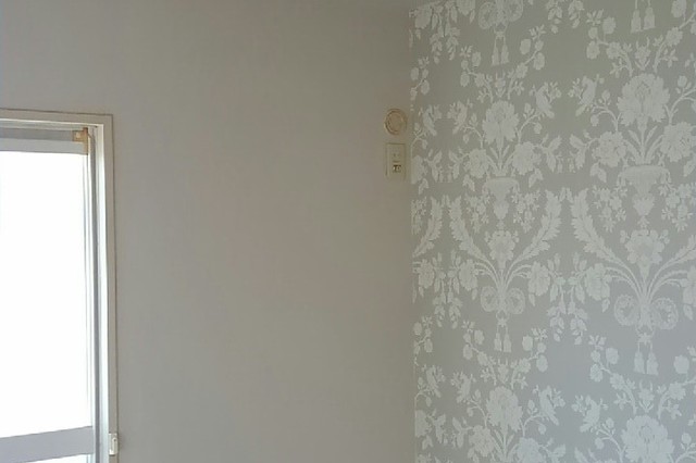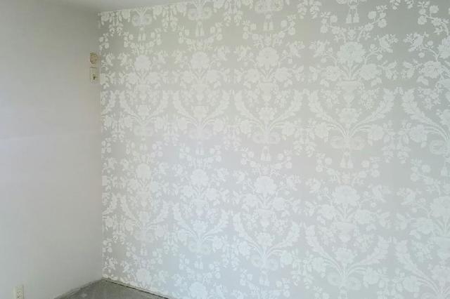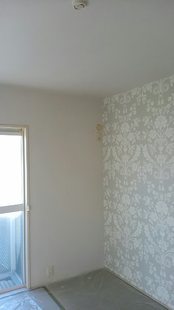 壁一面と天井のクロスを貼替えました。壁一面にはお客様のご希望で洋物のクロスを使用しました。 作業期間:1日 費用:約100,000円(うがしクロス処理費用込み) 広さ約6帖